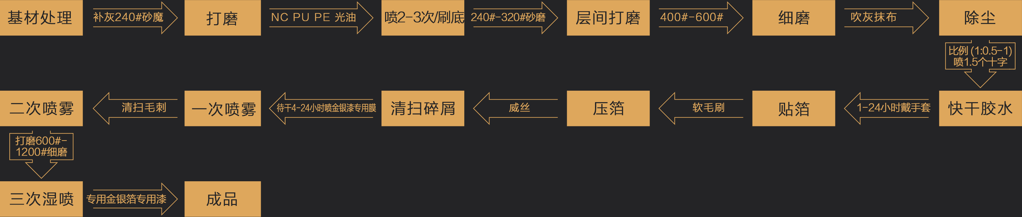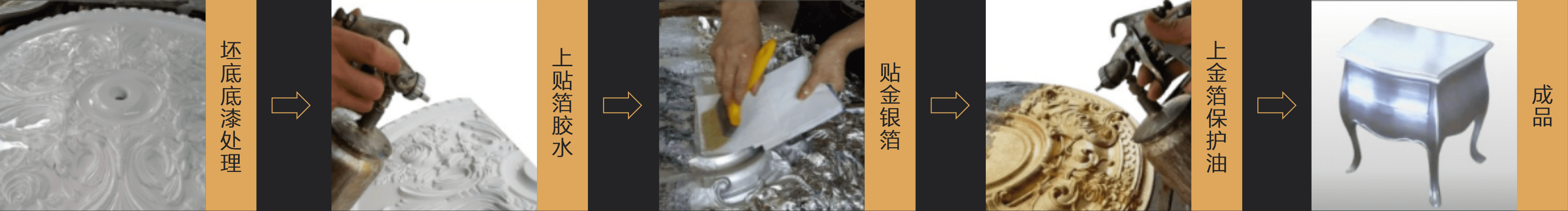 同樣的材質,選用不同的工藝,可以做出不同檔次的產品效果,根據不同 的材質選用不同的底,膠水、貼箔手法,其他工藝基本相同。最重要是掌握好時間、 配套膠水、配套金銀箔保護漆等步驟,